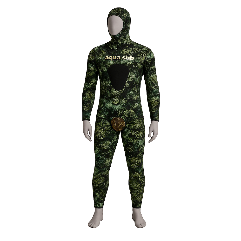 Un traje de buceo de neopreno de 5,5 mm con estampado camuflado, diseñado principalmente para la pesca submarina, apnea o buceo en aguas moderadamente frías.